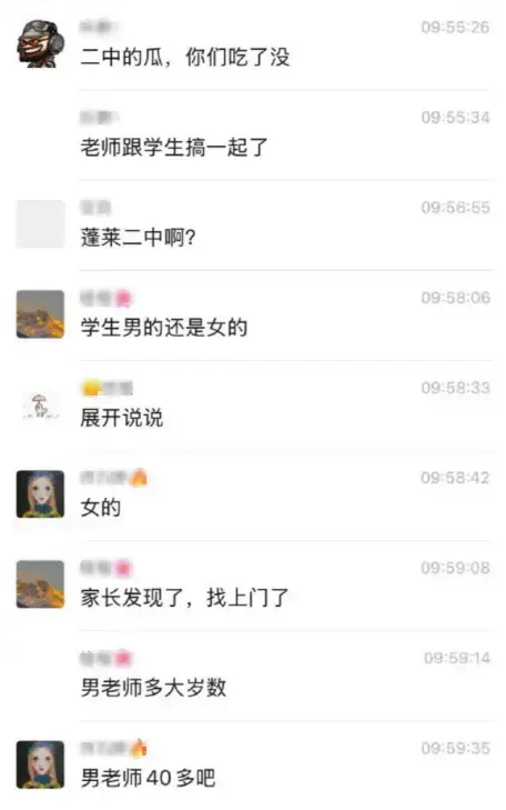 山东蓬莱二中一位家长查看孩子手机,发现班级群内教师与学生聊天记录有不当内容,教师作业答疑时言语轻佻。家长反映后校方先否认,后因更多截图曝光承认。此事件暴露师德问题,教育部门已介入调查。